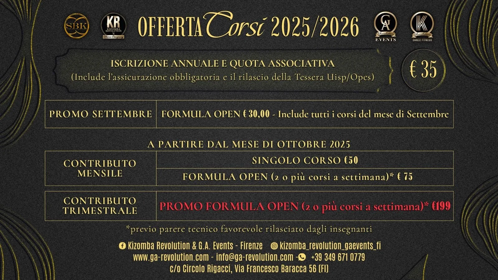 Acquista online la tua serata di lezioni (2 o più ore) per partecipare a tutti i nostri corsi collettivi previsti per quella data, salta la coda e vola dritto a lezione!